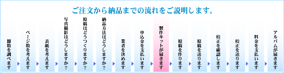 製作キットは、アルバム製作のしおり・アルバム作成ガイド・生地見本・原稿用紙・データ作成用台紙などとなっております。